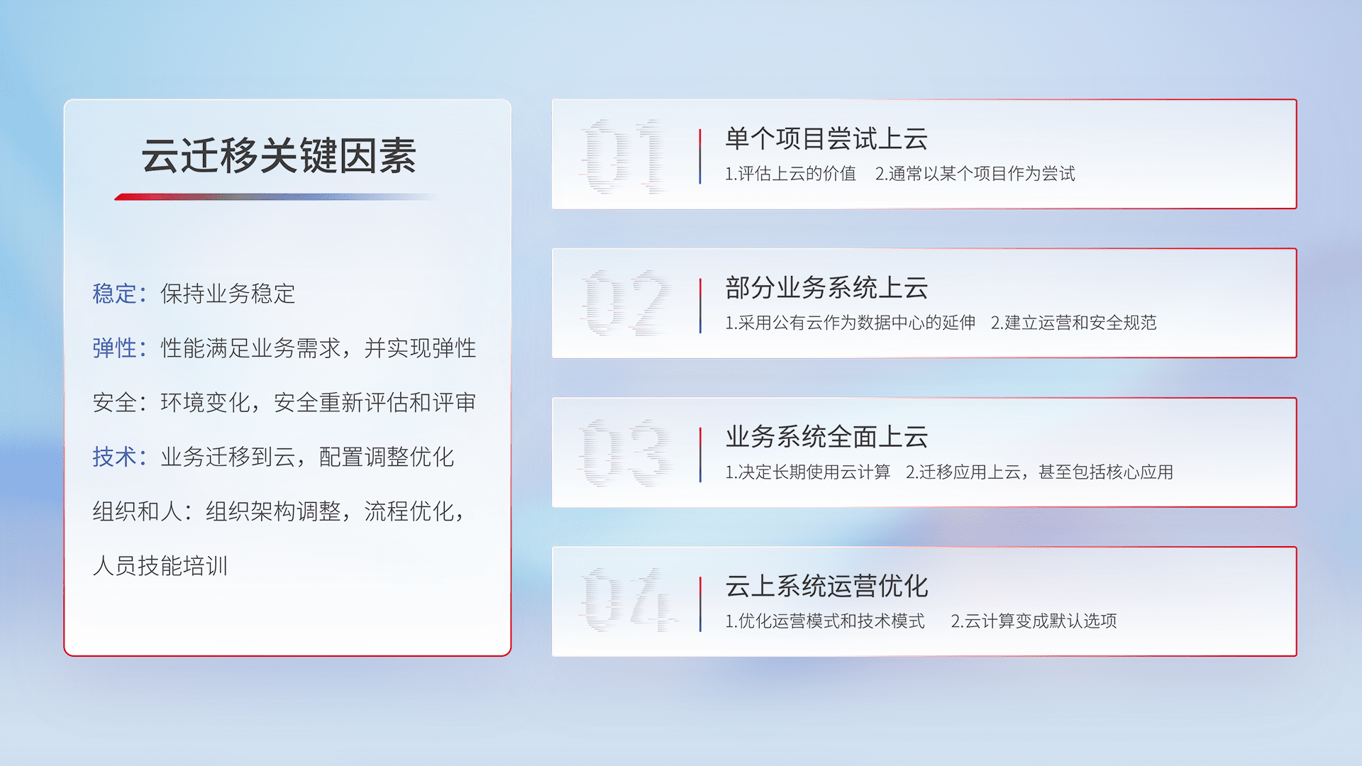 结合实际业务,,,从规划设计、、、、云平台选型、、云原生改造、、、、数据迁移、、集成交付,,,迁移全过程为客户识别最佳上云路径,,,做好风险识别管理,,,,设计网络架构、、、、身份权限、、、、安全审计合规、、操作审计、、、日志审计、、、监控告警策略、、、、多站点容灾设计等,,,,对云上基础设施进行整体规划,,,,提升IT治理水平,,,以满足弹性、、、高可用、、、、高性能的需求。。。。