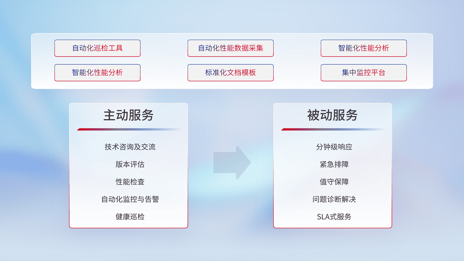 智能化工具和标准化文档,,保障服务质量,,,,提供主动服务(包含技术咨询、、版本评估、、性能检查、、、自动化监控与告警、、、、健康巡检)和被动服务包含(分钟级响应、、、、紧急排障、、、、值守保障、、、、问题诊断解决、、、、SLA服务)。。。。